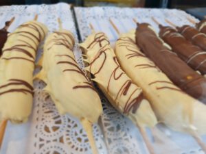 Chocoladefruit: Ook kunnen wij s ‘zomers voor u onze luxe fruitstokken maken met allerlei soorten fruit zoals aardbeien, banaan en druiven. Deze dompelen wij vervolgens in echte Callebaut melk-, wit- of pure chocolade.