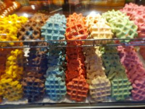 Rijkelijk gedecoreerde Luikse wafels: Naast onze versgebakken Brusselse wafels verkopen wij ook rijkelijk gedecoreerde Luikse wafels. Deze dompelen wij zelf in echte Callebaut chocolade of suikercoatings in allerhande vrolijke kleuren en bestrooien we deze met spikkels, marshmallows en andere lekkernijen. Daardoor is het ook bijna altijd mogelijk een evenement-gethematiseerde wafel te maken.
